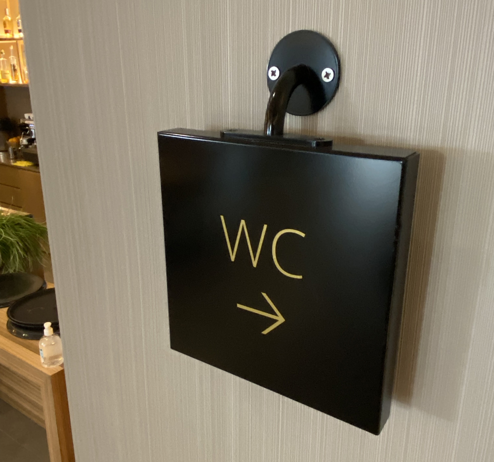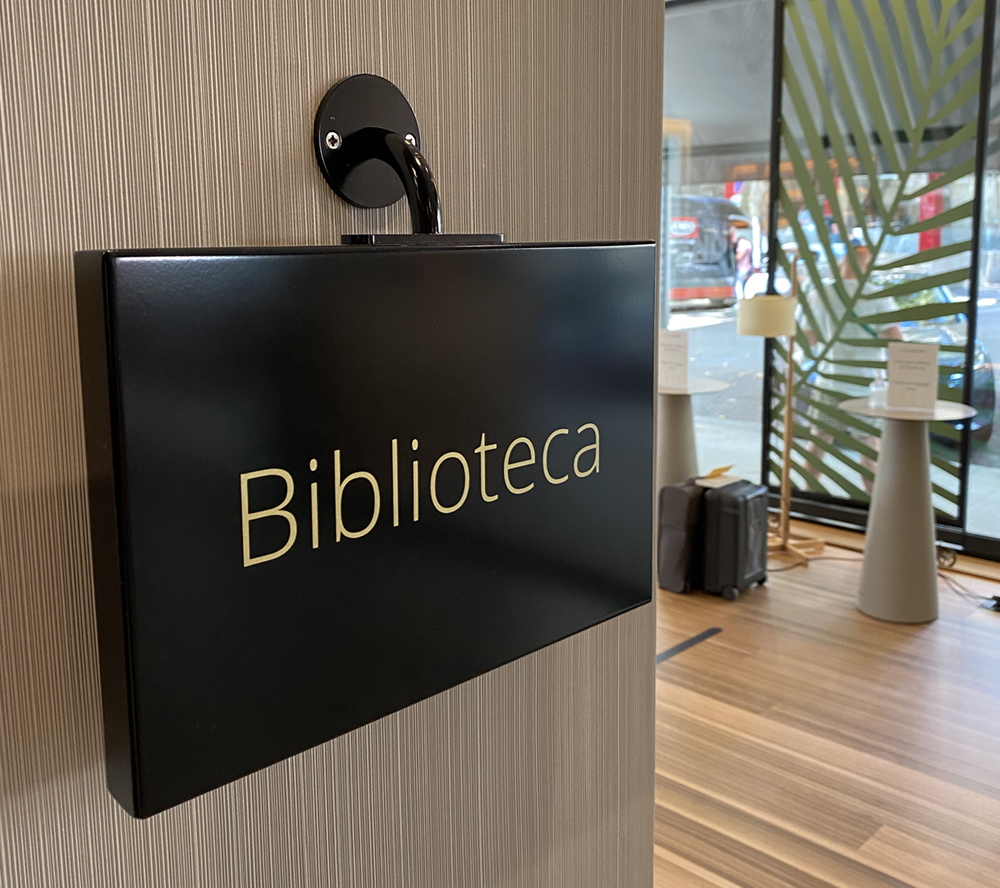 - Señalización interior en aluminio lacado negro y rotulado con vinilo dorado.